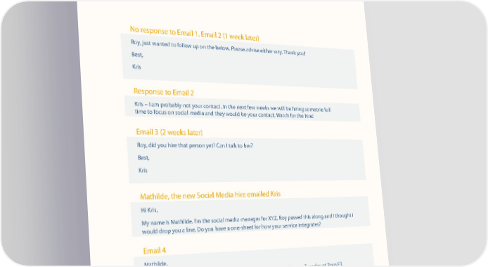 HOW TO GET YOUR FIRST 10 CUSTOMERS 10 REAL-LIFE EXAMPLES No response to Email 1. Email 2 (1 week later) Roy, just wanted to follow up on the below. Please advise either way. Thank you! Best, Kris Response to Email 2 Kris – I am probably not your contact. In the next few weeks we will be hiring someone full time to focus on social media and they would be your contact. Watch for the hire! Email 3 (2 weeks later) Roy, did you hire that person yet? Can I talk to her? Best, Kris Mathilde, the new Social Media hire emailed Kris Hi Kris, My name is Mathilde. I’m the social media manager for XYZ. Roy passed this along and I thought I would drop you a line. Do you have a one-sheet for how your service integrates? Email 4 Mathilde, I’d love to talk to you and answer your questions. Do you have time on Tuesday at 3pm ET. Best, Kris the alchemist institute